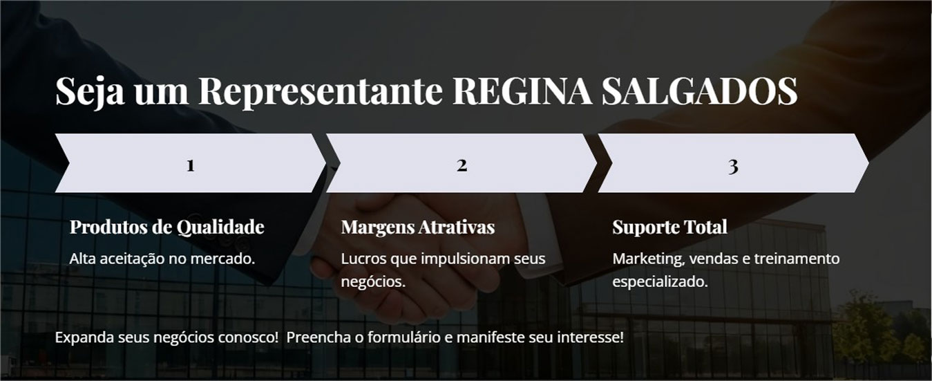 A Regina Salgados está expandindo e queremos você como nosso parceiro! Se você busca uma oportunidade de negócio lucrativa, representando produtos de alta qualidade e grande aceitação no mercado, venha fazer parte da nossa equipe de representantes.